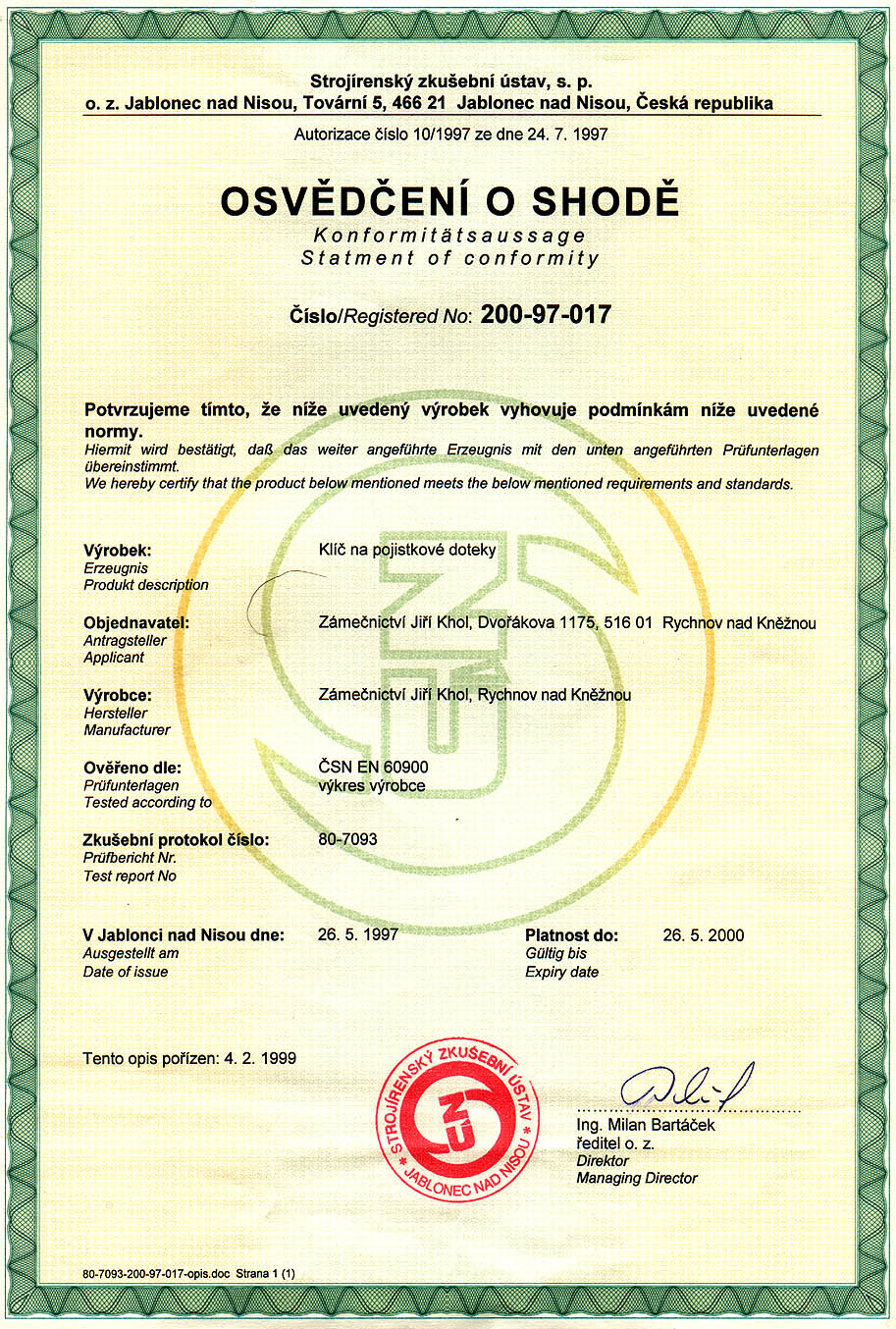 Klíč na doteky je nářadí určené pro montáž a demontáž doteků pojistkových souprav E27 a E33, v tomto provedení je konstruován pro práce pod napětím do 1000V střídavého napětí a byl odzkoušen státní zkušebnou.