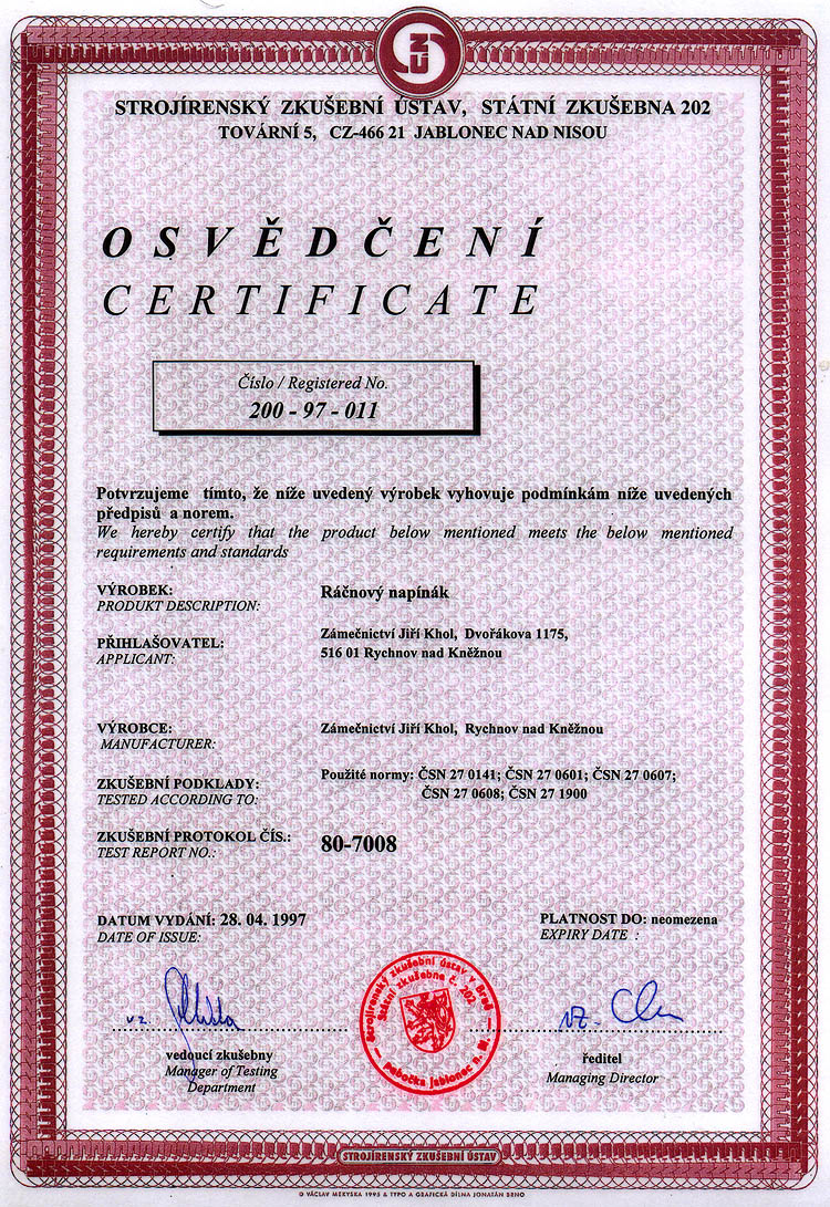 Ráčnový napínák je určen pro napínání vodičů při provozně montážních pracech v energetice. Své uplatnění snadno najde i v jiných odvětvích, při kterých je požadována uvedená tažná síla.Výrobek je odzkoušen strojírenským zkušebním ústavem.